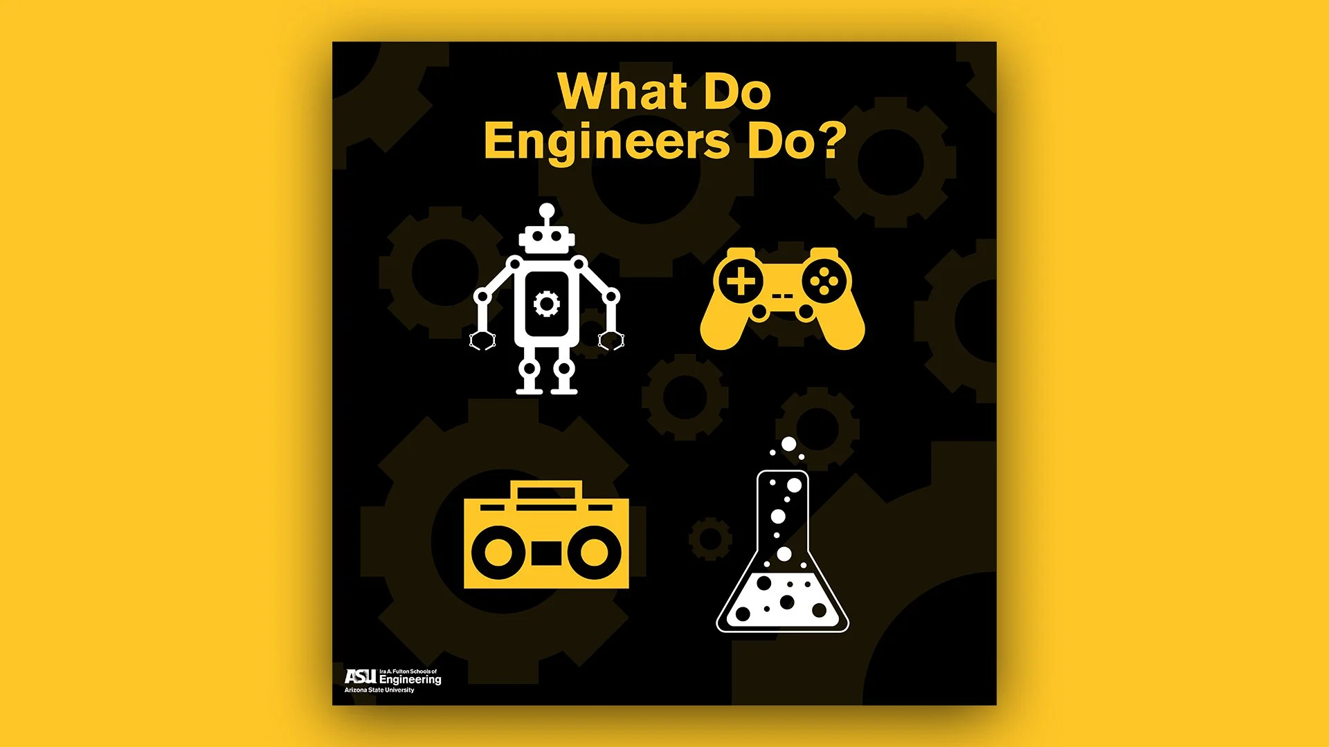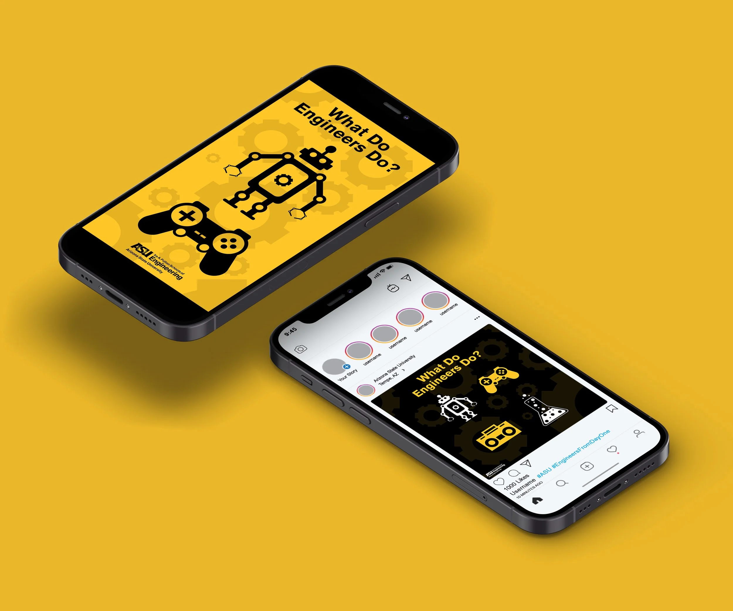 Engineers from Day One is a student-focused initiative by ASU’s Ira A. Fulton Schools of Engineering built around a simple idea: engineering isn’t just advanced technology — it’s part of everyday problem-solving and creativity. The campaign called for printed posters and digital graphics that felt bold and approachable, while still aligning with ASU’s established brand system.